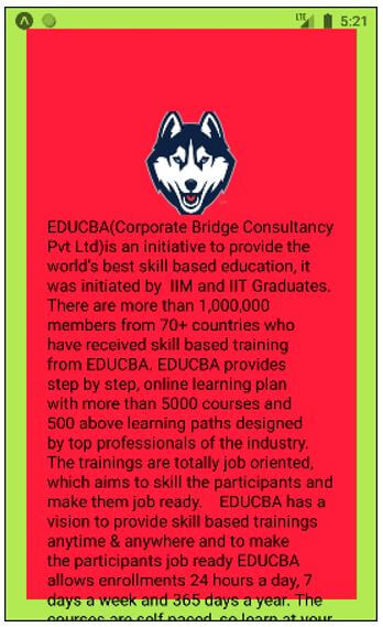 Below we have displayed a basic example where we have styled the Safeareaview using “padding, backgroundColor, borderWidth and borderColor; we have displayed the desired text “EDUCBA” within that Safeareaview.