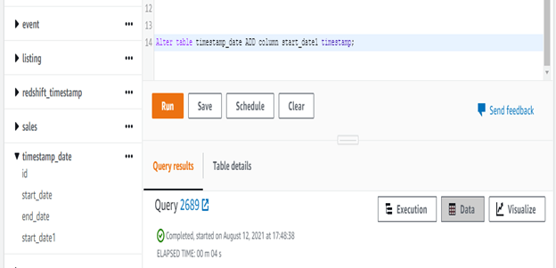 - Add column – This command is used to add a column in redshift. After adding a new column to the table we have assigned the datatype as a timestamp.