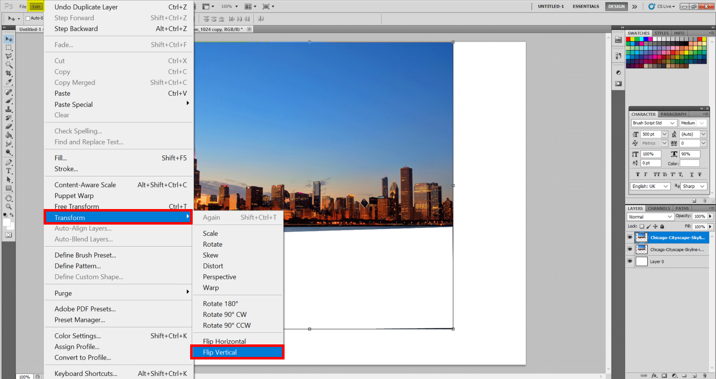 Step 4: Now duplicate the layer by selecting Duplicate Layer and select Edit and Transform, then Flip Vertical. You will see an upside-down image of the cut part. So by using the move tool, place it below our original image.