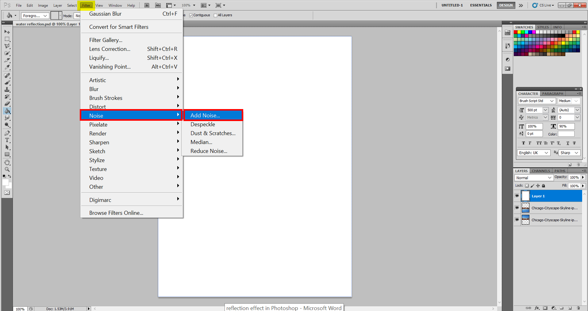 Step 7: Normally, one would be satisfied with what we have created, but let’s experiment a bit more and put more effects. First, let’s create a new layer and fill it with white colour using the Paint Bucket tool. Also, let us give it a Noise Filter to give the water waves a more natural rippled effect. So, go to Filter>Noise>Add Noise. Make sure you have selected the new Layer here. Now set the following values (again, these may vary as per image) Amount: 400 %, Distribution: Gaussian and check the Monochromatic button.