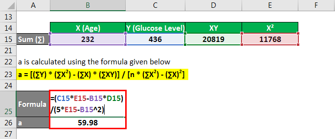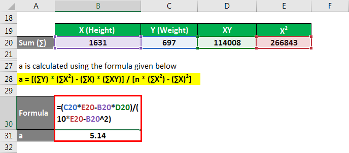 Step 4: Next, determine the intercept of the regression line that remains constant irrespective of the explanatory variable’s value. It is denoted by “a” and is calculated based on the number of data points (n), explanatory and dependent variable by using the following formula