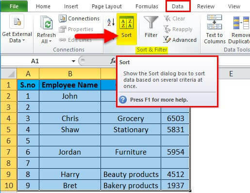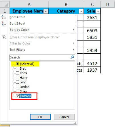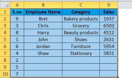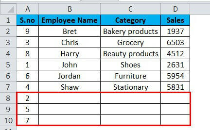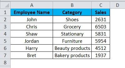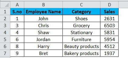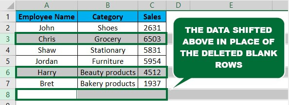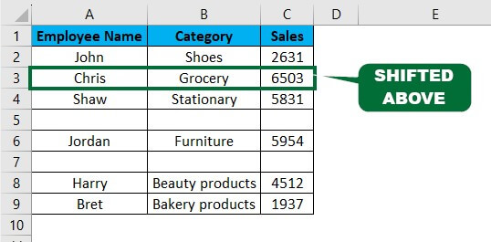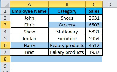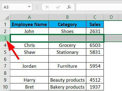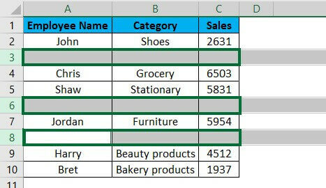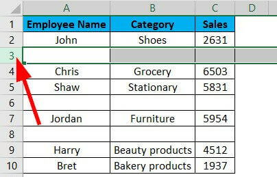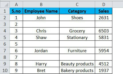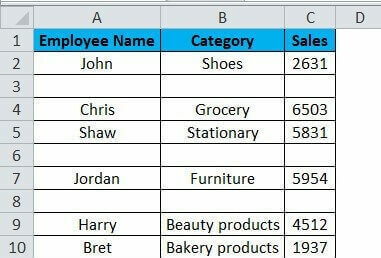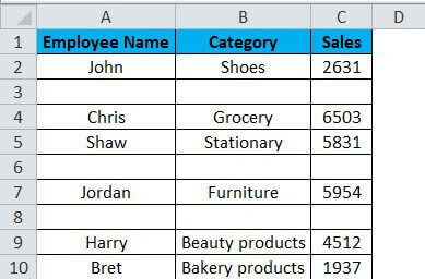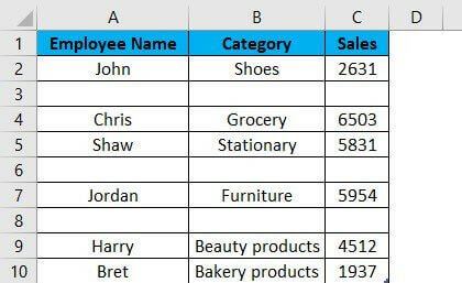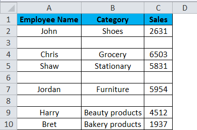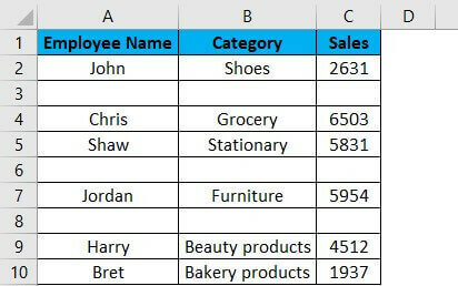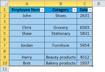 The below-mentioned table contains Employee Name in column A, Product Category in column B & Sales in column C. We must delete empty rows in the following table range using the Excel “SORT-BY-COLUMN” method.