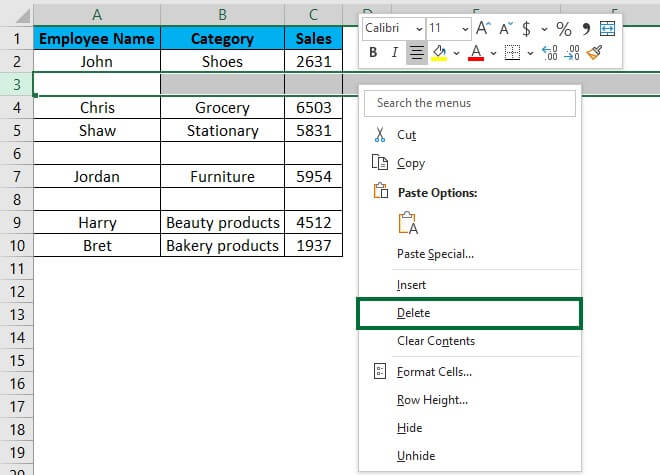 The table elaborates on the employees’ sales performance for different categories of products in three columns, i.e., Employee Name in column A, Product Category in column B & Sales in column C. We need to delete blank rows in the following table range with the help of SHORTCUT KEYS in Excel.