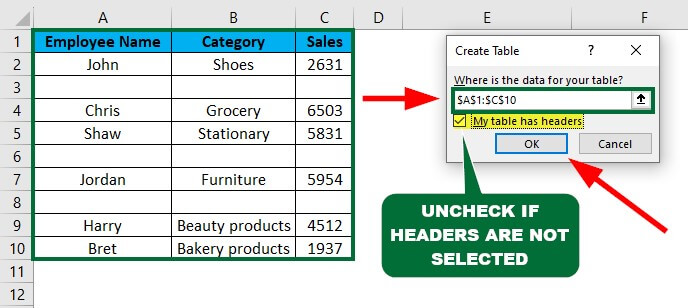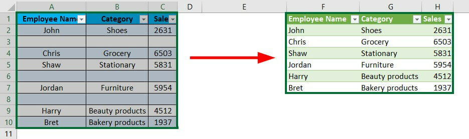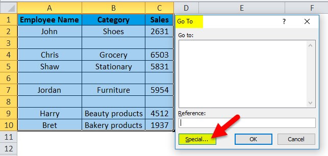 The table contains Employee Name in column A, Product Category in column B & Sales in column C. We must delete empty rows in that table range with the “Go to Special” function In Excel.