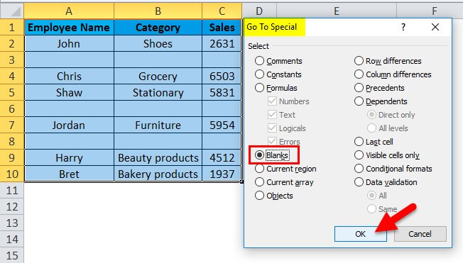 Step 3: Click the ‘Blanks’ radio button and press OK.