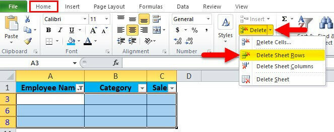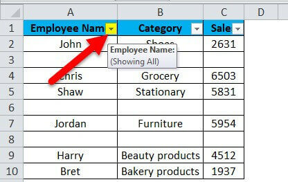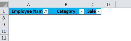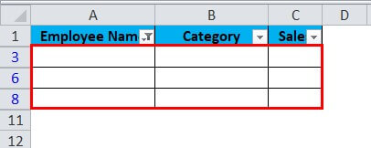 The data in the following table represent Employee Name in column A, Product Category in column B & Sales in column C. We need to delete blank rows in the following table with the help of “EXCEL FILTER FUNCTIONALITY” in Excel.