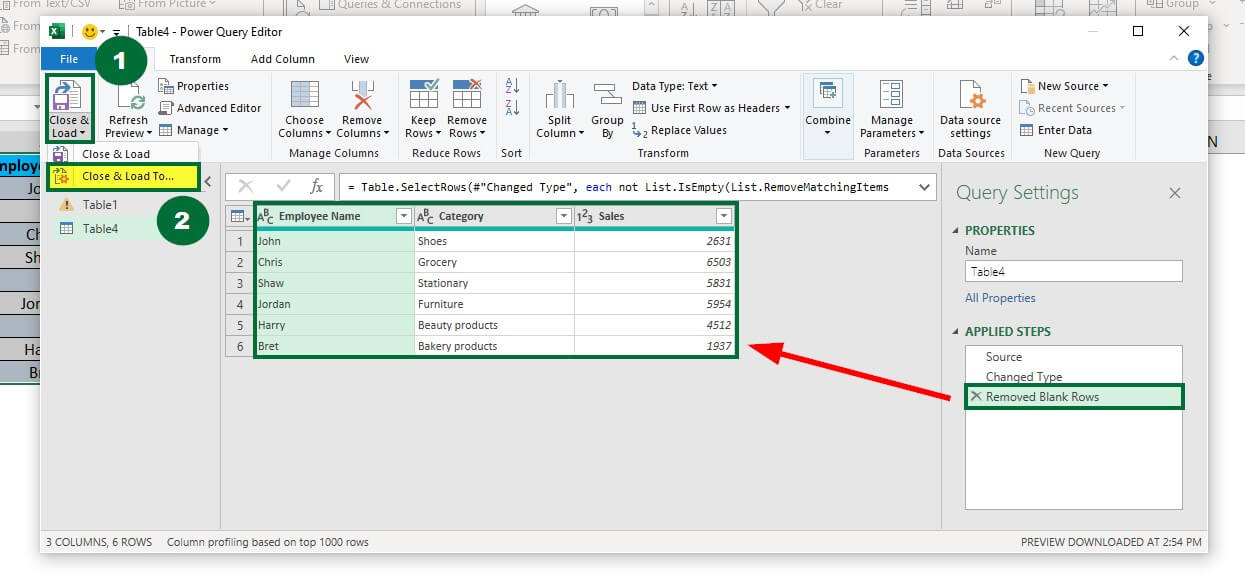 The following table provides a breakdown of sales information in three columns: Employee Name in column A, Product Category in column B & Sales in column C. We need to delete rows containing no data in the following table range with the help of POWER QUERY EDITOR in Excel.