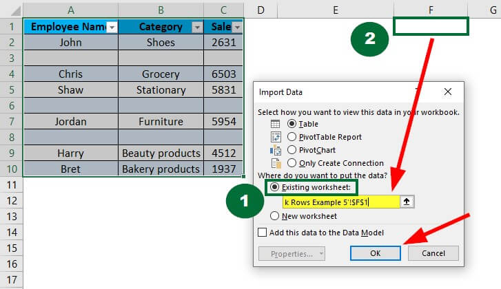 Step 5: Select a desired cell (F1) to import the new data in the “Where do you want to put the data?” section of the Import Data dialog box and click OK.