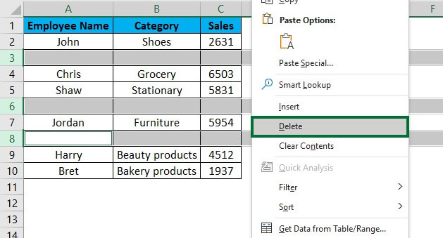 The table contains information about employee sales through three columns: Employee Name in column A, Product Category in column B & Sales in column C. We need to delete empty rows in this table range manually.