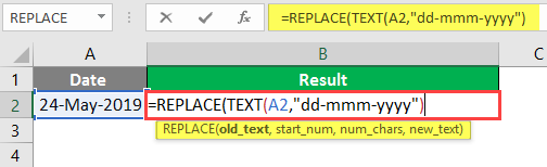 - While working with Dates, ensure you convert it into text and later replace it with the required text. If the result requires in Date format, not in text format, then input the DATEVALUE function to the result of REPLACE function.