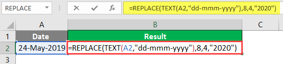 First, we need to convert the data into text format using the TEXT function, and the format is “dd-mmm-yyyy” Then, we will replace 2019 with 2020.