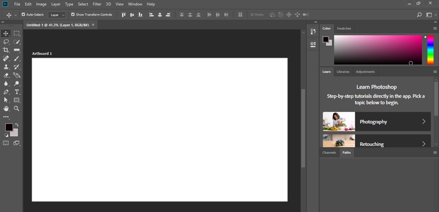 Step 1: In the topmost sections of the user screen of this software, there is a ribbon which we called the Menu bar. This ribbon has a number of menus which help us in managing of different parameters of this software; below this, we have the property bar of our active tool or active image through which we can make changes in parameters of that tool; below this toolbar; we have three sections that are, at the left side we have tool panel which has a number of tool for making our work easy in this software, at the center of this sections we have display window in which we can see our current working, at the right side we have some panels for making some adjustment in our work that are color panel, layer panel, and some others. You can adjust all these sections at any place on the working screen according to your requirement.