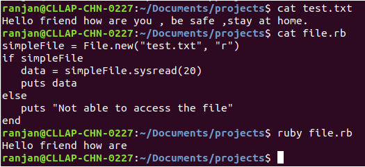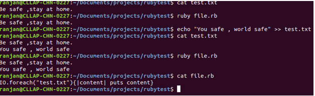 Ruby file provides a beautiful way to deal with the file systems; it has many I/O methods which are used in the kernel modules; in ruby, there are many important methods for dealing with the file system, and all these methods are derived from the I/O classes, there are some important file operations like read(read the file), write(write on the file), puts(read the variable and print the value assigned to this variable), gets, princ, print (print is similar to the puts, the only difference is it will not start from the new line it cursor will be on the same line)and readline which are very common for the file system.