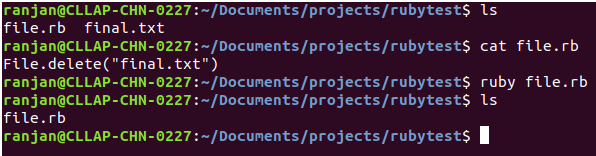 - Finally, we run the command ruby file.rb, which executes the code and it will delete the file.