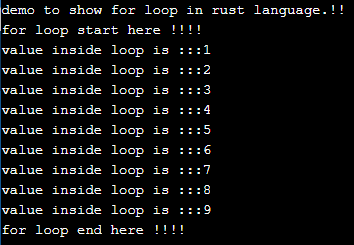 1. In the above example, we are trying to iterate the number from 1 to 10 using for loop in rust. This is a sample example for beginners to understand and implement in the program.