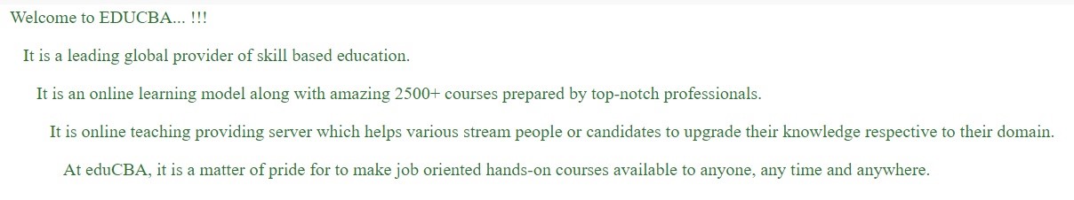 <p class = "p1"> Welcome to EDUCBA... !!! </p>