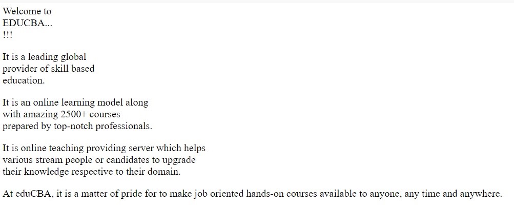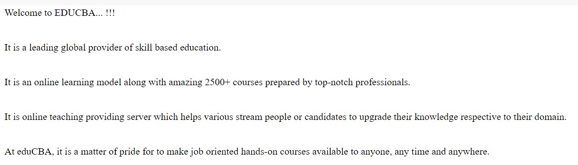 <p class = "txt1"> Welcome to EDUCBA... !!! </p>