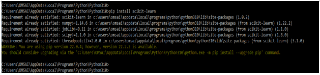 1. In the first step, we install the sklearn module in our system. We are using the pip command to install this module. Also, we can use any other command to install the same module in our system.
