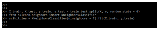 scikit_lea = KNeighborsClassifier(n_neighbors = 7).fit(X_train, y_train)