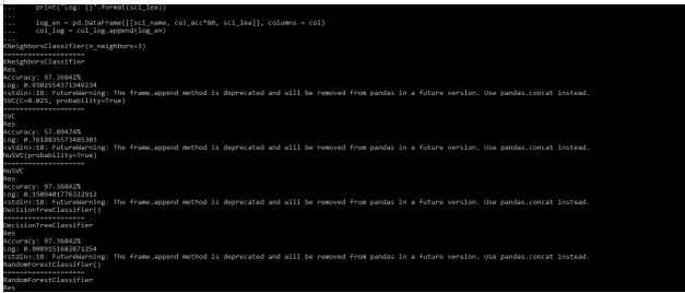 7. After training the classifier in this step we are printing the accuracy of the classifiers as follows.