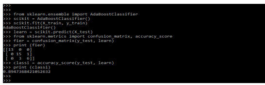 Below is the example of scikit learn classifier as follows. In the below example, we are defining the adaboost classifier as follows.