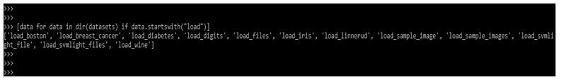 It will offer us to get the datasets from sklearn. To define its structure, we need to import the datasets as follows. In the example below, we are importing all the datasets, then using the dir function to check all the attributes associated with the datasets.