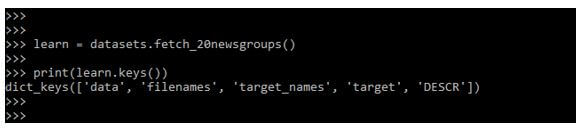 We can load the real-world datasets by using the below command as follows. In the below example, we are loading the fetch_20newsgroups datasets as follows. Also, we are checking the keys of the specified dataset as follows.