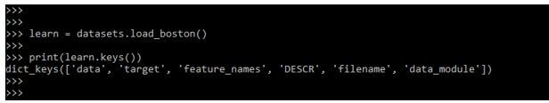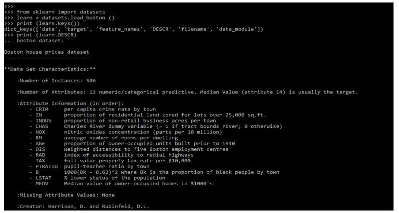 In the example below, we are loading the dataset name as load_boston as follows; we are retrieving fundamental values.
