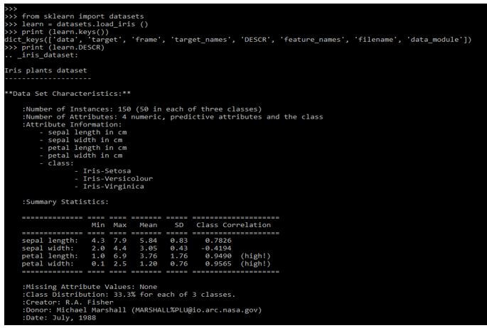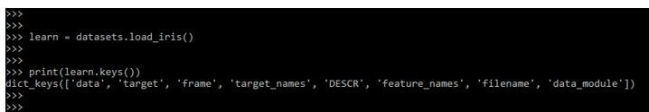 In the example below, we are loading the dataset name as load_iris as follows; we are retrieving fundamental values.