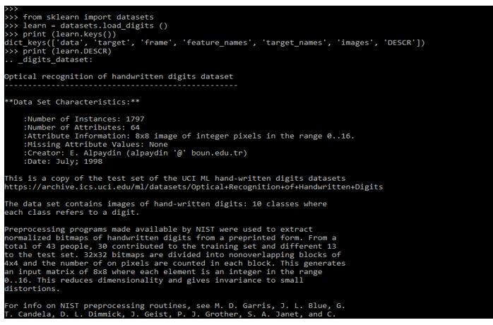 In the example below, we are loading the dataset name as load_digits as follows; we are retrieving fundamental values.