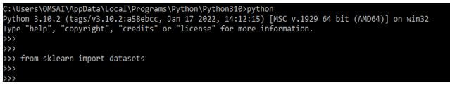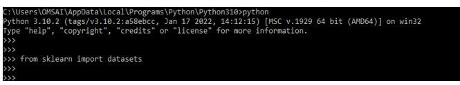 2. After installing or checking the version of python, we are importing the datasets which hold the seven datasets as follows. We are importing the datasets from the sklearn library and using the import keyword for importing the datasets.