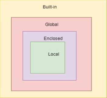 The LEGB rule searches the Namespaces for scope resolution. The LEGB stands for :L: Local, E: Enclosed, G: Global, B: Built-in. The sequence of LEGB is important. First, the program searches for the variable in the local scope, then in the enclosed scope, followed by the global scope, and finally in the built-in scope.