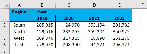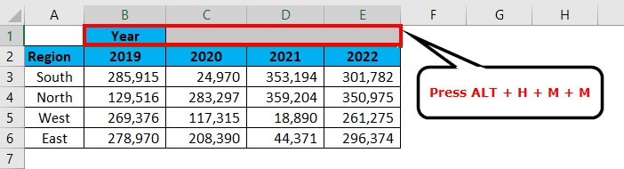 Step 2: Next, we also need to merge the cells containing the region names. To do this, select cells A1:A2 and use the same shortcut key ALT + H + M + M.
