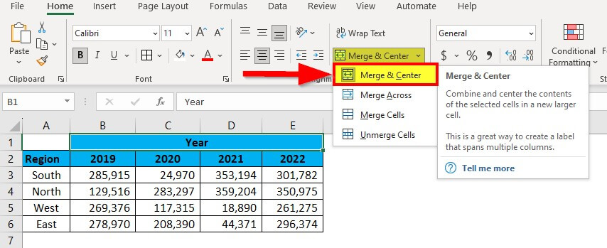 Alternatively, you can use the “Merge & Center” button under the Home tab.
