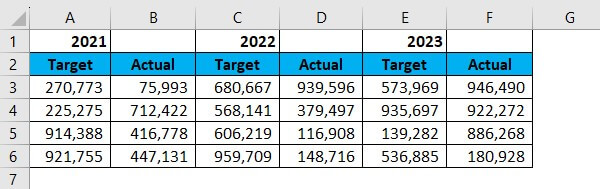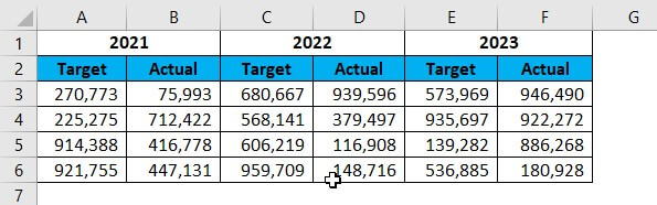 Below is the data for “Target” and Actual numbers for 2021, 2022, and 2023. Let’s see how we can merge the cells for each year and display the Target and Actual data below the corresponding year.