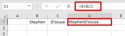 We can use the “&” operator in a formula to merge cells. For example, if we wish to merge cells B1 and C1, we can use the formula =B1&C1.