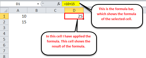 In cell D1, I have entered the formula as =10+15. This is not the dynamic formula because I have not given any cell references here. Suppose I want the formula to show 30. As a result, I need to edit the formula and change the values.