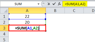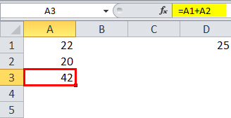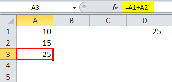 Now, look at the above image. Instead of supplying the values directly to the formula, I have referenced cells A1 and A2. In cell A3, I have mentioned the formula as =A1+A2.