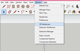You can excess the 3D Warehouse library in two ways in Sketchup. First is, go to the menu bar, which is at the top of the working screen, and click on the Window menu of it. In the scroll-down list of this menu, you will find the 3D Warehouse option.