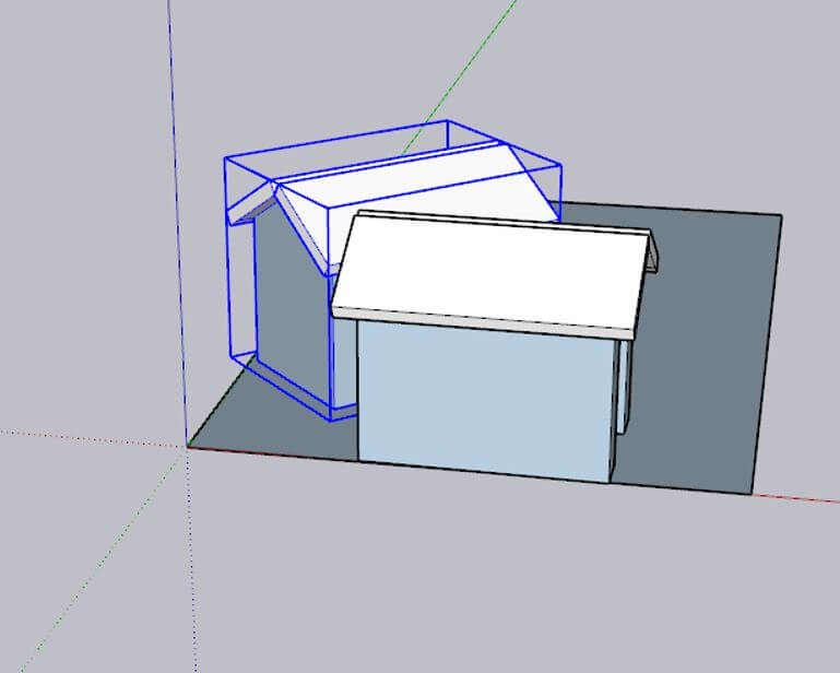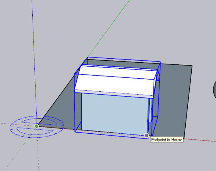 Step 16: Now we can select rotate tool or press Q and when you hover over the house component you can see the axis on which the rotation is aligned a small protractor can be seen. The protractor also shows on which plane you will rotate along. As you move the mouse SketchUp inferences to the faces where you want to rotate along. You can even lock the axis on which you want to rotate so that SketchUp would not guess the axis. So, tap right to lock to red axis, tap top to lock on the blue axis, tap left to lock on green axis.