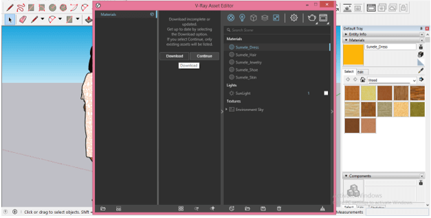 If you click on this left arrow button then you will have list of material of Vray. You can download all material from Vray by clicking on Download button. After downloading you can apply Vray material on your model by the same way as we applied SketchUp materials.