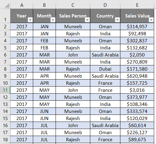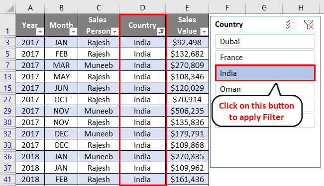 Step 5: You can use each country button to filter the data. For example, If I Want to see the data associated with India as a country, I just need to click on the India slicer button and see the magic. It will apply a filter on the table for all the rows with India as a country. See the screenshot below.
