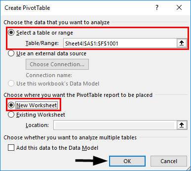 Step 2: A new window named Create PivotTable pops up as soon as you click on the PivotTable button under the Tables section. Select all the data as a Table/Range and select the location where the pivot will be added. Click OK once done. Please see the screenshot below.
