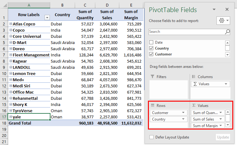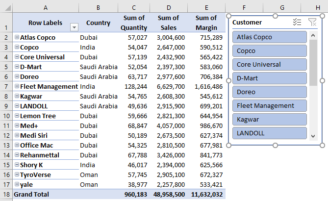 I can select the specific customer under the slicer or multiple customers simultaneously (hold the CTRL button and click on the customers one by one you want) and apply the filters on the pivot table.