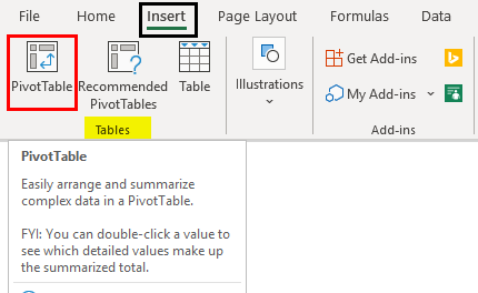 Step 1: Click on the Insert tab placed on the upper ribbon of the active Excel sheet. You will find out an option called PivotTable under the Tables section. Click on it to insert a pivot on the current working sheet.