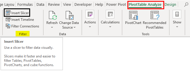 Step 5: There are different options available for analysis under this tab. Click the Insert Slicer button under the Filters section in Analyze tab to insert a slicer.