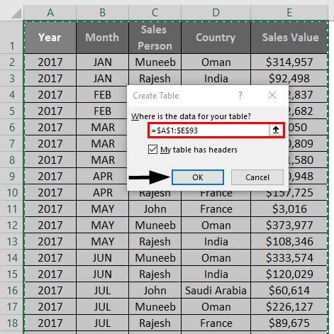 - Select all the data across A1 to E93 and insert a table for these ranges. It will pop up a new window called Create Table with all the ranges we have selected to insert Table. Click on the OK button.