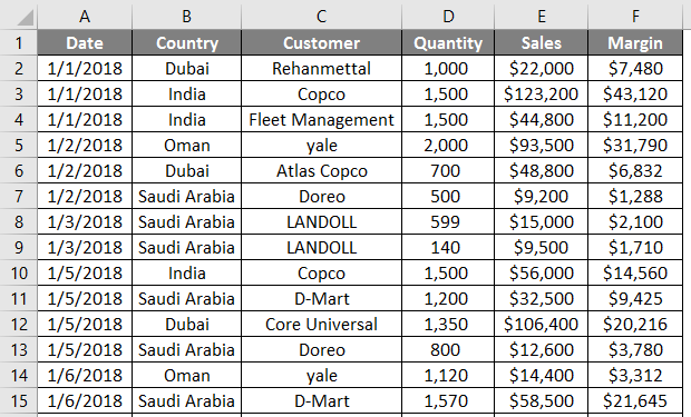 Suppose we have data on customer-wise sales for 2018 day by day, as shown in the screenshot below. This data accumulates 100 rows. See the partial screenshot below for your reference.