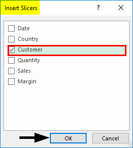 Step 6: As soon as we click on the Insert Slicers button, a new window pops up with all the column names present, based on which you can insert slicers on your pivot. Tick the one which you want to add as a slicer. I want to add the Customer column under Slicers and hit OK. See the screenshot below.