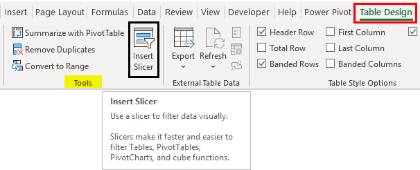 Step 2: Click on the Design tab to see a series of options under it. Click on the Insert Slicer button under the Tools section inside the Design tab. It will allow you to add slicers to the table.